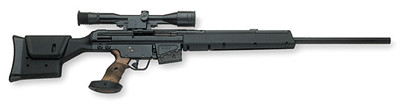 | PSG1 7.62mm Precision Marksman Rifle Precision accuracy at extremely long ranges demands a truly specialized rifle. HK responded to the task by designing the ultimate long range firearm...the PSG1. A heavyweight barrel, trigger mechanism with a constant three pound trigger pull, adjustable buttstock, and adjustable handgrip are some of the features that make the PSG1 more accurate than any other semi-automatic rifle. Each PSG1 rifle is shipped with an assortment of accessories that do more than just round out the rifles usefulness, they complement the rifle itself, turning it into a complete system for the marksman. This includes a specially-fitted aluminum alloy hard case for transportation and protection, extra magazines, adjustable sling, cleaning and maintenance equipment, as well as a user tool kit. Also included with each rifle is a Swiss-made tripod, that functions as a unique shooting support for the rifle, especially when used from a benchrest. These accessories, provided with every PSG1, make the PSG1 truly alone in its class. The steel shell of the receiver itself is nitro-carburized (in a process similar to what is done to the USP pistol slides) to increase surface hardness and to provide yet another level of accuracy enhancing reinforcement. The nitro-carburizing process also helps to prevent the sort of finish damage to the gun that rough handling can sometimes produce. The end result of all of this strengthening and reinforcing is a receiver that mates bank-vault tight to the heavy barrel, to provide the highest level of accuracy. The barrel and receiver assembly are virtually locked together tight enough so that, just like the operating parts in a glass bedded bolt action rifle, there is minimal movement or play. This allows the roller-locked action of the PSG1 to return and lock up consistently shot after shot after shot. |