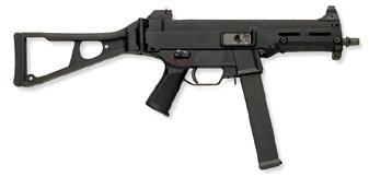 | UMP The UMP is a cost-effective, state-of-the-art submachine gun that offers users the advantages of light weight, low initial purchase and maintenance costs, uncompromising reliability, and precision accuracy with low felt recoil. The UMP is available in .45 ACP and .40 S&W variants. The UMP45 provides the user with a magazine capacity of 25 rounds* with an accurate range of 100 yards or more, well beyond that of any issue handgun or shotgun. Due to its small size (less than 18 inches with the buttstock folded) and 41/2 pound unloaded weight, the UMP is the perfect choice for use in or around vehicles. Its size and low weight also make it the ideal weapon for smaller stature officers who have difficulty handling the size, weight, and excessive felt recoil of a full size rifle or shotgun. The UMP45 is designed and tested to fire all types of .45 ACP ammunitionincluding subsonic and supersonic loads, cartridges assembled with ball, high performance hollowpoint projectiles, and even enhanced velocity +P offerings. The UMP45 also fires non-toxic and frangible training ammunition without modification. For familiarity of training, the UMP offers fully ambidextrous operating controls and sling attachment points similar to those found on other HK rifles and submachine guns. A convenient bolt catch holds the bolt open when the last round is fired and along with the flared magazine well makes for quick and easy reloads. Hard points molded into the polymer receiver of the weapon allow for the attachment of a wide assortment of optional mounting rails and accessories, such as assault sights, tactical lights, and vertical foregrips. Additional standard features include fully adjustable iron sights with a dual flip-up rear aperture, an HK multi-purpose tactical carrying sling, and a detachable vertical handstop. Optional tritium sights are also available. UMP firing mode choices include semi-automatic only, semi-automatic and 2-round burst, or semi-automatic and fully automatic modes of fire. With the exception of the barrel, bolt, and certain internal component parts, the UMP45 is constructed entirely from tough, lightweight glass-fiber reinforced polymer. The UMP magazines, also made of high strength polymer, feature a transparent ammunition-viewing strip that allows the user to see the type and quantity of ammunition inside. The sturdy UMP folding buttstock has a rubber cheek piece and buttpad and reduces the overall length of the weapon by nearly ten inches when closed. Like all HK submachine guns, the UMP fires from the closed bolt position to improve accuracy and enhance safety when handling the weapon. A passive internal firing pin block within the bolt prevents the weapon from firing if dropped. |